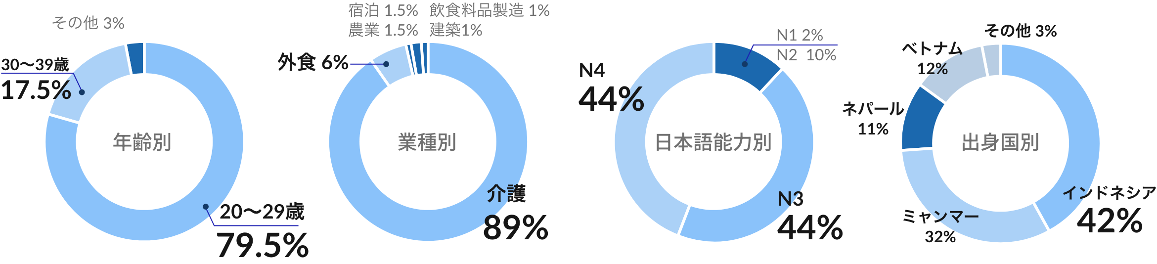 hubleでは特定技能人材の教育および就業後の支援に力を入れており、幅広い業界での活躍・定着を実現しています。