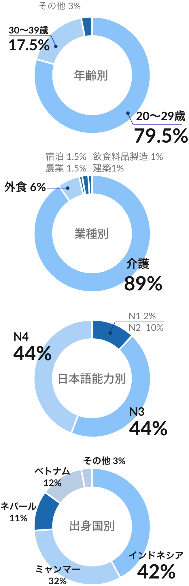 施設の介護職員から病院の看護補助まで、介護医療分野で活躍するさまざまな外国人人材の紹介が可能です。グループ内の介護施設において多くの紹介実績があり、高度な対話能力が求められる介護現場に適した人材育成に注力し、リスクマネジメントの経験も豊富です。介護分野では特定技能評価試験合格者が、働きながら介護福祉士資格取得を目指すケースも多く、就業後も資格取得に向けて手続きや勉強をワンストップでサポートします。